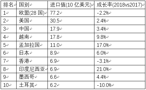 For example (Table 3) As shown, in terms of value, the European Union (28 countries), the United States, and China ranked among the top three textile importers in the world in 2018, accounting for 37.5% of the total global import value. Although its market share is close to 37.7% of the previous year, it is still far lower than more than 50% in 2000.