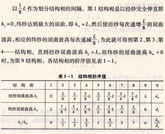 Answer: The division of structural order generally takes the two extreme states of warp and weft yarn buckling waveforms as the starting point and end point of change, and the change process is divided into 8 intervals at equal intervals. There are nine interval points including the starting and ending points. The buckling state of warp and weft yarns at each interval point is a structural phase, and there are nine structural phases in total. Since the sum of buckling wave heights of warp and weft yarns in any waveform state is always equal to a constant, which is equal to the sum of diameters of warp and weft yarns, assuming this constant is L, then L=hj+hw=dj+dw It can be seen from Table 1-1 that the buckling wave height of warp and weft yarns is closely related to the structural phase. The higher the structural phase, the greater the buckling wave height of warp yarns, and the smaller the buckling wave height of weft yarns. The relationship between buckling wave height and structural phase can be expressed quantitatively as follows: