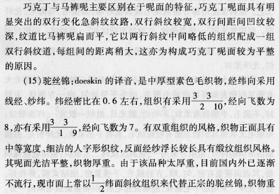 (1) Serge: Serge is the transliteration of serce. Serge is divided into fine noodles, and there are two types: finished noodles and cashmere noodles. The finishing process of serge is required. Depending on the unit weight, serge can be divided into three types: thick serge, medium-thick serge and thin serge. Thin serge has a light and soft body and is very suitable for women and children’s work wear. The style characteristics of serge are that the twill grain on the surface of the fabric is relatively wide and flat, the grain is not protruding, the twill angle is about 45°, the weft-to-warp density ratio is about 0.86, the weave is 2/2 right-skew, and some thick serges also use 3/3 Right slanted.