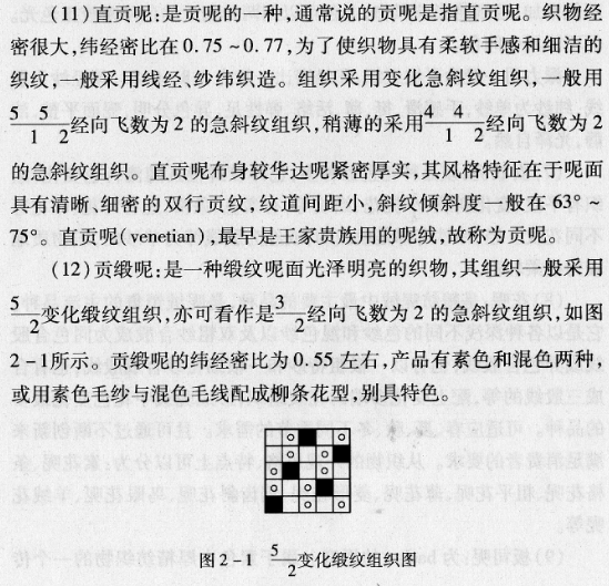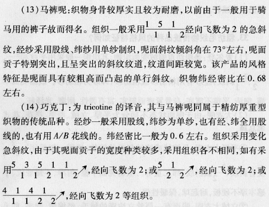 (10) Single-sided tweed: A double-warp weave that adopts warp layering. It is named after the different patterns on the front and back sides. Colored inserts and jacquard inserts are generally used to weave different stripes or patterns on the front and back sides. , and uses the left and right twist directions of the spinning yarn to weave hidden stripes as narrow as the width of a toothpick, so it is called toothpick tweed. The characteristics of the fabric are that the body is tight and thick, the hand feels smooth and waxy, the surface shows hidden stripes, it is stable and generous, and the front and back have different patterns. It is a high-end representative variety among worsted products. The weft/longitude density ratio is between 0.64 and 0.70.