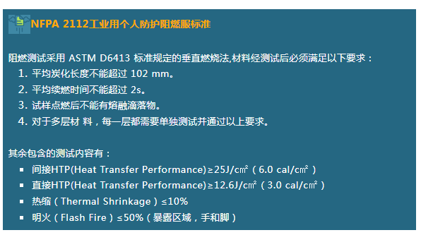 The National Fire Protection Association has formulated a series of standards for the technical performance of different flame-retardant protective clothing. The main ones related to flame-retardant fabrics are NFPA2112