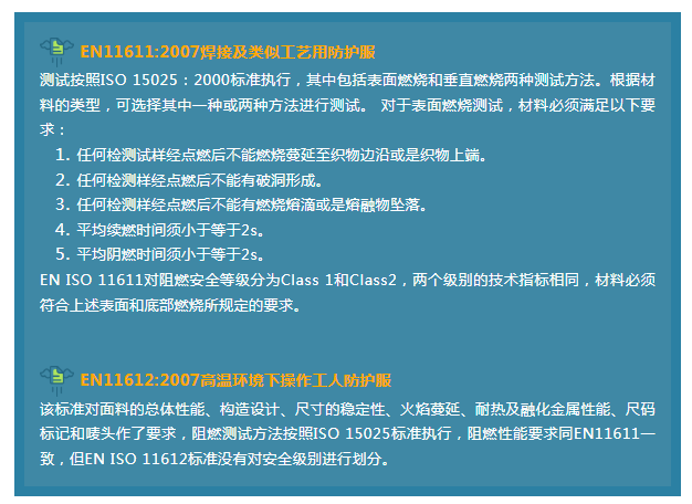 The EU’s flame retardant testing standards for protective clothing are mainly formulated by the European Technical Committee (CEN/TC). The current standards include EN ISO 11611:2007, EN ISO 11612:2008, EN ISO 14116:2008/AC:2009