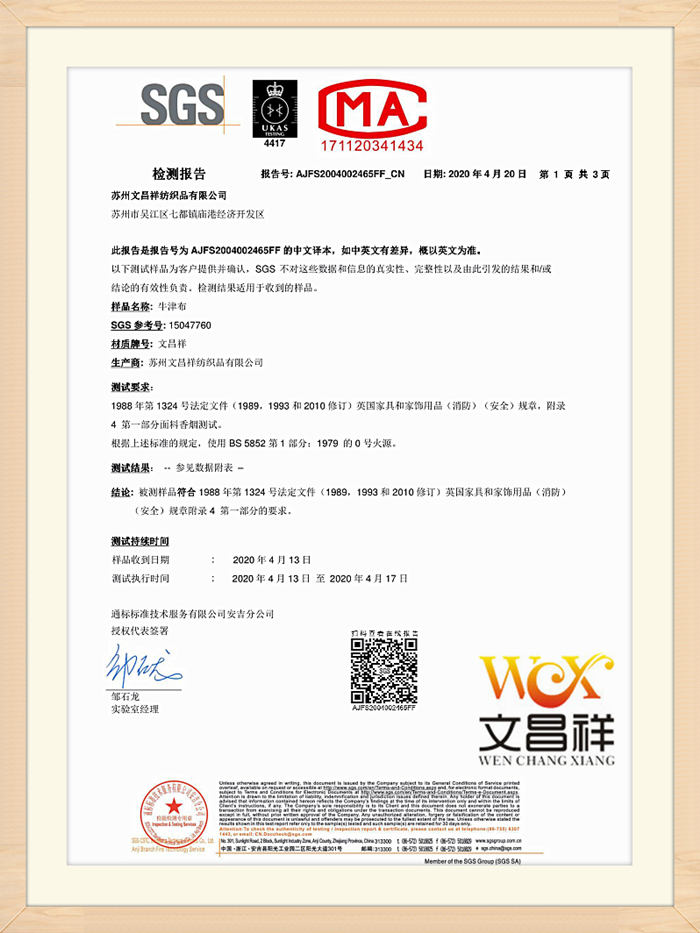 British Standard BS 5852 Flame Retardant Standard Report-Suzhou